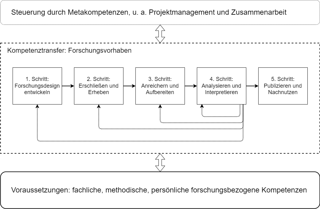 Unter den Grundlagen bzw. den Voraussetzungen für jedes Forschungsvorhaben werden die Kompetenzen verstanden, die sich auf die Kompetenzdimensionen Fachkompetenz, Methodenkompetenz und Persönlichkeitskompetenz beziehen, wobei in der Darstellung dem weiter zu fassenden Begriff Strategie der Vorzug gegeben wird. Im Rahmen des Wissenstransfers müssen diese Grundlagen auf das jeweilige Forschungsvorhaben übertragen werden, um den hier skizzierten Forschungsprozess durchlaufen zu können. Dem Forschungsprozess (und den Grundlagen) übergeordnet sind die Metakompetenzen, die für den Wissenstransfer und die Steuerung des Forschungsprozesses essentiell sind. Die Fähigkeit zur Zusammenarbeit und zum Projektmanagement werden hier als pars pro toto für mögliche weitere Metakompetenzen wie Präsentation der Projekt-/Forschungsergebnisse genannt.